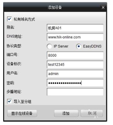 选择私有域名方式添加,协议类型选择成海康DDNS,填写设备域名、用户名、密码,即可正常使用iVMS-4200客户端软件访问设备。