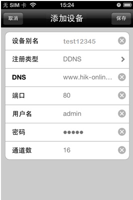 打开iVMS-4500手机客户端,进入“设备管理”界面添加设备。设备别名处输入注册的设备域名(例如test12345),注册类型选择DDNS,DNS地址默认为www.hik-online.com,端口为80(固定填写),输入设备用户名密码,保存之后即可进入预览界面预览。